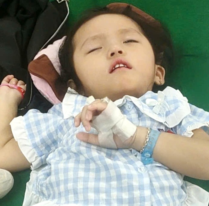 Bé Khánh An từ lúc được 3 tháng tuổi đã phát hiện bị chứng u nang mạng nhện ở não ( Arachnoid cyst ), bất sản thể chai ( Agenesis of the Corpus Callosum – ACC ), động kinh toàn thể, đột biến gen, chỉ nằm một chỗ, được điều trị tại khoa Thần Kinh, Bệnh Viện Nhi Đồng 2, Sàigòn. Bảo Hiểm Y Tế trả 100% viện phí nhưng gia đình phải tự mua các thuốc đặc trị ngoài danh mục bảo hiểm rất tốn kém.