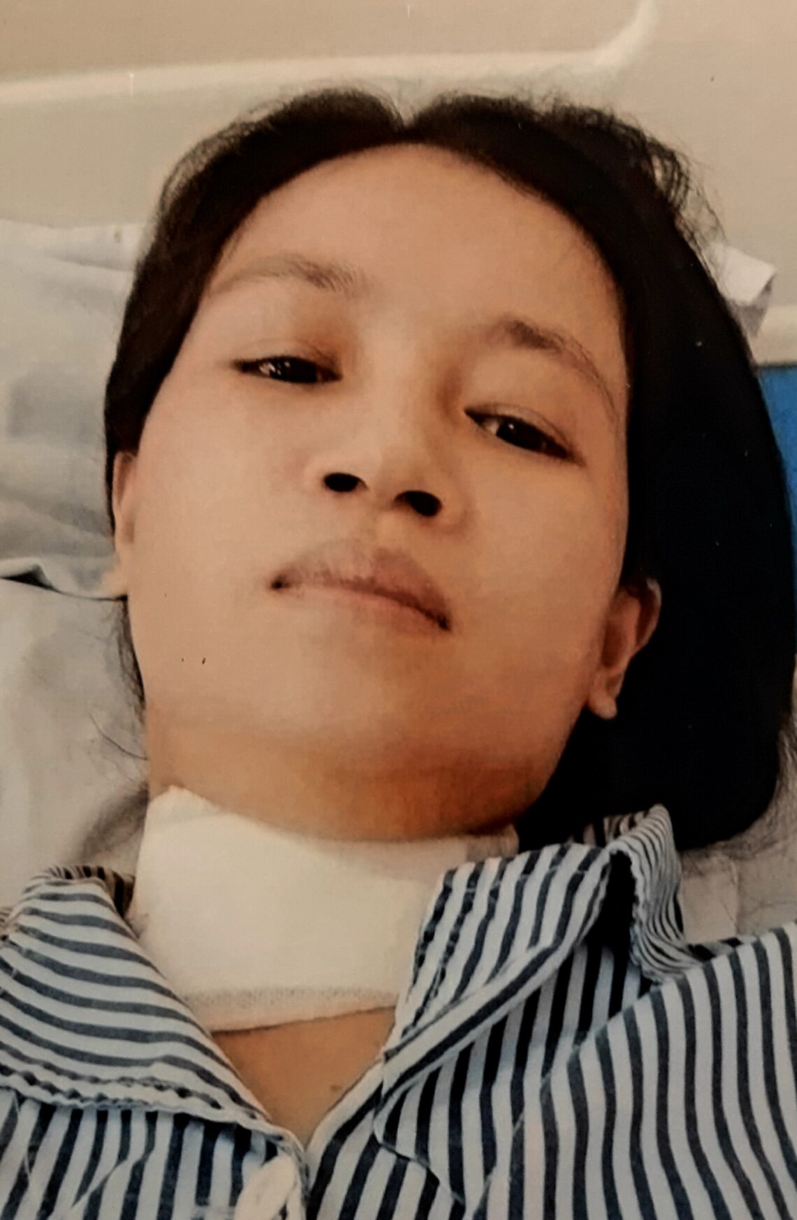 Chị Thủy bị chứng bệnh Carcinoma ( ung thư tuyến giáp ) gây ra bướu cổ, cần phải gây mê nội khí quản, mổ cắt thùy phải tuyến giáp và nạo vét hạch. hiện đang nằm điều trị bằng nội khoa tại Bệnh Viện Nội Tiết Trung Ương Hà Nội. Chị Thùy dù có Bảo Hiểm Y Tế nhưng vẫn phải mua nhiều thuốc đặc trị ngoài danh mục bảo hiểm và chi phí chăm sóc đi lại xa nhà rất tốn kém nên hiện tại rơi vào tình trạng kiệt quệ và bế tắc.