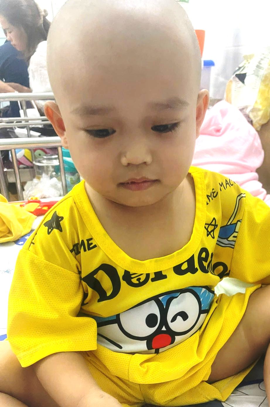 Cháu Phúc bị bệnh bạch cầu cấp dòng Lympho. một dạng ung thư máu, hiện đang điều trị tại lầu 1 phòng 5, khoa Ung Bướu-Huyết Học, Bệnh Viện Nhi Đồng 2, Sàigòn, bác sĩ cho biết phác đồ phải hóa trị 7 toa.